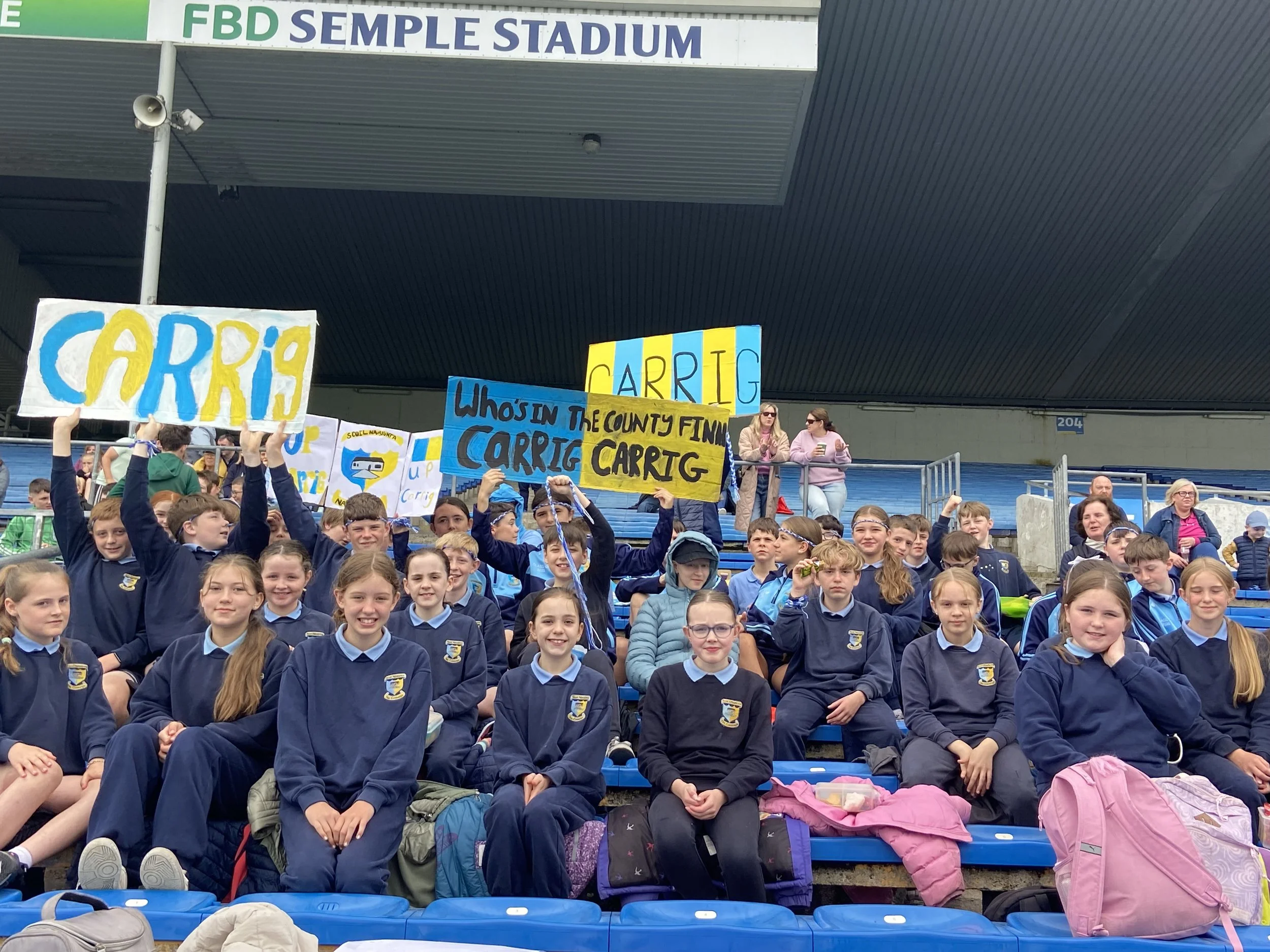 Each year we take part in U11 and U13 hurling, camogie and Gaelic football competitions as part of Cumann na mBunscol. Great emphasis is placed on the promotion of Gaelic games here in Carrig N.S. Hurling and camogie coaching takes place throughout the year both during and after school. The boys and girls are coached by their teachers Mr Prout, Mr Meagher, Miss Maloney, Ms. O'Brien, Ms O'Halloran and Ms.Meagher who generously give up their time to coach the children after school hours.